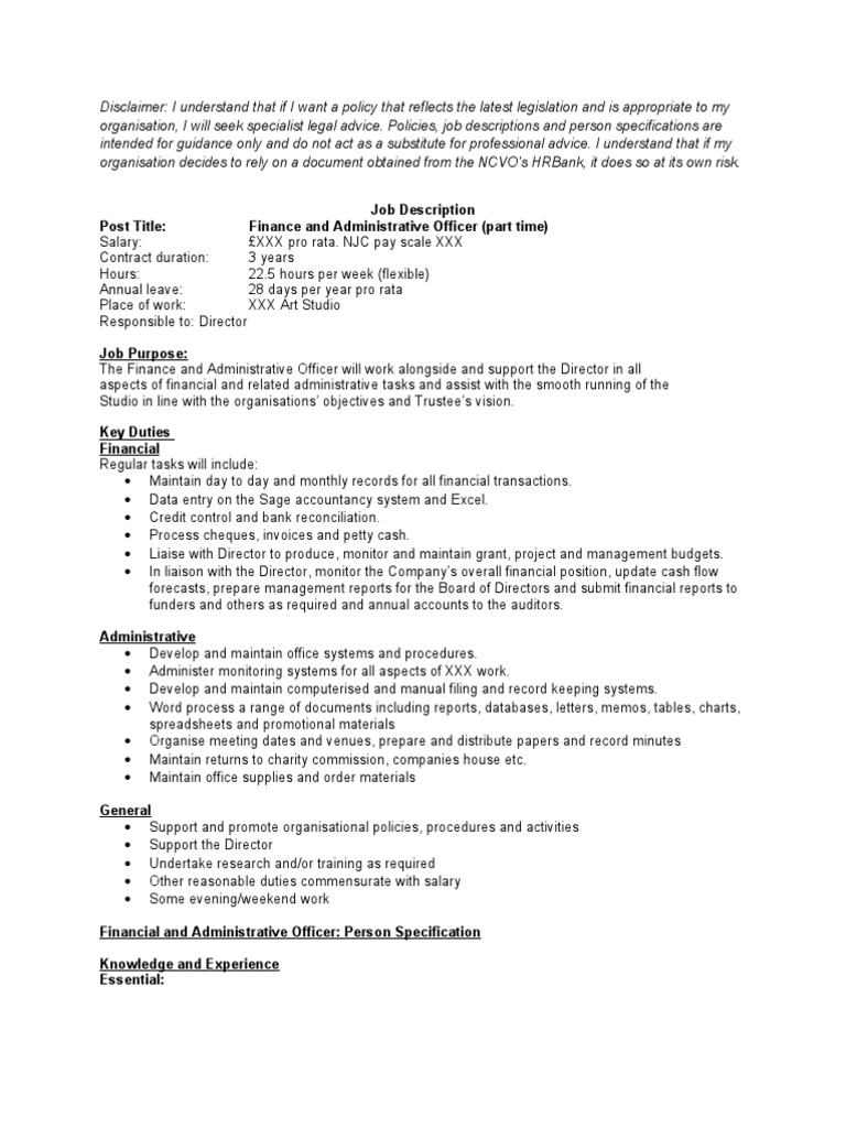 1/2017 • the understanding and willingness to work spontaneous hours under pressure is necessary. Examples of director of finance and administration job descriptions from real companies. Director of finance & administration job description reports to: Visit payscale to research director of finance & administration salaries by city, experience, skill, employer and more. If you have a background in finance and knowledge of bookkeeping activities, we'd like to meet you.